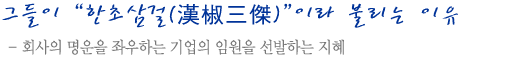 많은 사람들이 중국의 역사 소설 중 하나인 《초한지(楚漢志)》를 알고 있을 것이다. 춘추전국시대였던 중국을 통일한 진나라의 진시황제가 만리장성을 만들고 아방궁을 만들며 착취와 폭정을 일삼자 진나라에게 망한 6국들의 후손들은 반란을 일으켰다. 《초한지》는 그 중 가장 대표적인 인물이었던 초나라 항우와 한나라 유방의 오랜 대결을 여러 인물의 활약과 처세를 버무려 세밀하게 그린 걸작 중의 걸작이다. 이 책에는 천하를 도모할 수 있을 만큼 뛰어난 무공과 역량을 지닌 수많은 호걸과 영웅들이 나온다. 이 중에 한나라 건국 공신 3걸, 즉 "한초삼걸(漢椒三傑)"이라 불리는 사람들이 있다. 이들은 한나라의 유방을 도와 역발산기개세(力拔山氣蓋世)라 불릴 만큼 엄청난 신력과 무공, 병력을 지닌 초나라의 항우를 제압하고 한나라를 건국하는데 중추적인 역할을 하는 장량(장자방), 소하, 한신을 말한다. 막강한 초나라와 경쟁하며 "바람 앞의 촛불"과 같이 위태로웠던 약소국가 한나라를 반석 위에 세우고 최후의 승자로 만들었던 이들 세 호걸의 활약은 그야말로 절대적이었다. 물론 넘치는 인덕과 용인술의 유방이 그들을 잘 경영한 것도 무척 중요했지만 유방의 부족함을 채워준 이들의 역량과 도움이 없었다면 한나라는 패망하여 과거의 지도에 있었던 소국 중 하나에 지나지 않았을 것이다. 그만큼 유방과 한나라에 있어 장량과 소하, 한신은 없어서는 안 될 최고의 참모이자 임원이었다.