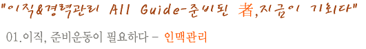 요즘 주목받고 있는 성공적인 기업의 화두가 CRM(Customer Relationship Management), 즉 ‘고객 관리’라면, 직장인들의 성공적인 경력관리를 위한 화두는 ‘인맥 만들기(Human Networking)’라고 할 수 있을 것이다. 인적 네트워크를 잘 구축하면 정보 수집에 도움이 될 뿐 아니라 인맥의 다양한 연결고리를 통해 이직 성공률을 높일 수 있다. 주변에 좋은 사람들을 두고, 그 인맥을 효율적으로 관리하는 것은 개인의 경력과 실력향상의 필수요소라고 할 수 있다.