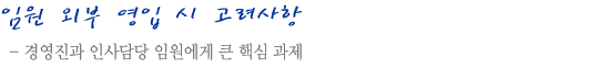 기업의 외부 임원 영입은 경영진과 인사담당 임원에게 큰 핵심 과제이다. 자질 검증, 충성심, 문화 적응력 등 여러 근거로 내부 임원 양성이 바람직하다고 강조되는 것이 주지의 사실이기도 하지만, 상당한 노력과 시간 등 에너지가 후보자 Pool 확보에 소요됨에도 불구하고, 임원들의 외부 영입 추세가 지속적으로 확대되고 있는 것 또한 현실이며, 추세이다. 결론적으로 내부 임원 육성과 외부 임원 확보 중 어느 쪽이 더 바람직한가의 문제는 성공, 실패 사례가 다양하기 때문에 어느 한쪽이 더 우월하다고 말하기는 쉽지 않은 만큼 양쪽의 조화가 필수적이라 하겠다.